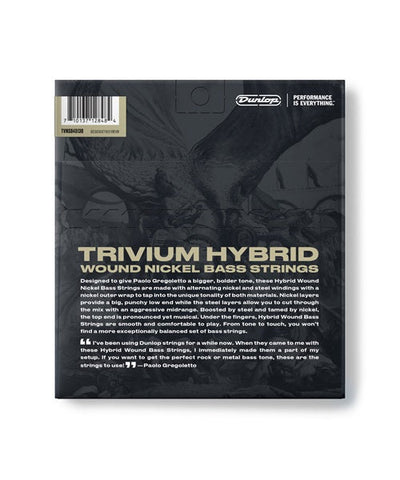 Las cuerdas "Trivium Hybrid" con Dunlop y Paolo Gregoletto ofrecen tono más grande y audaz, estas cuerdas están hechas con bobinados alternos de níquel y acero con una envoltura exterior de níquel para aprovechar la tonalidad única de ambos materiales. Las capas de níquel proporcionan unos graves grandes y contundentes, mientras que las capas de acero le permiten atravesar la mezcla con un rango medio agresivo. Bajo los dedos, las cuerdas de bajo Trivium Hybrid son suaves y cómodas de tocar. Desde el tono hasta el tacto, no encontrará un juego de cuerdas de bajo más excepcionalmente equilibrado.