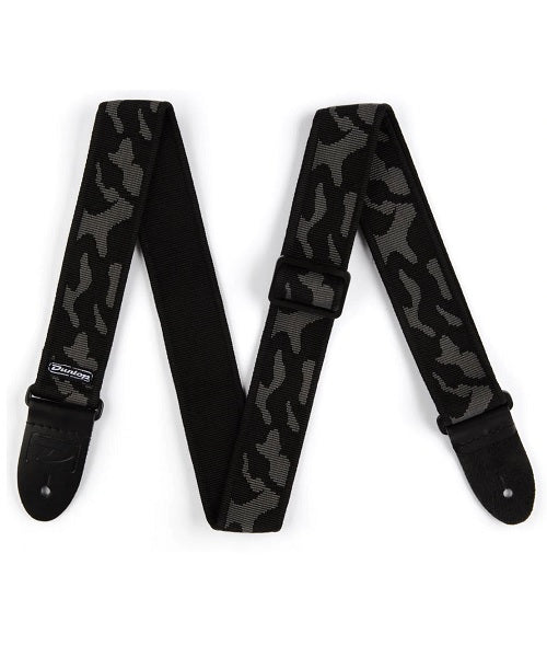El tahalí Dunlop serie D-38 cuenta con hebillas personalizadas de fácil ajuste, correas de borde de confort patentadas, correas extra largas, extremos 100% de cuero, diseños de tejido jacquard original y tejidos de poliéster.